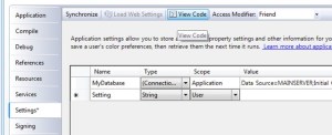 With .NET 2.0 came the “My” classes, a useful feature of the classes was the integration into the “app.config” file and project properties for configuration of settings, including connection strings.
